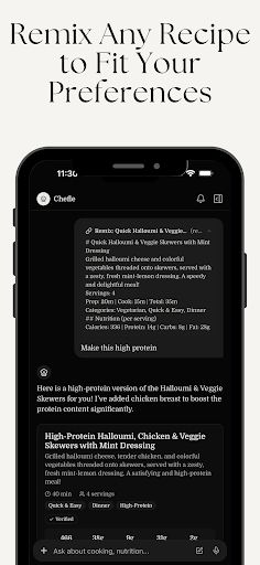 Chat with your AI chef to make recipes tailored to you. Ask for high-protein meals, keto-friendly dinners, kid-friendly lunches, anything. Chefle remembers your preferences and gets smarter each time.